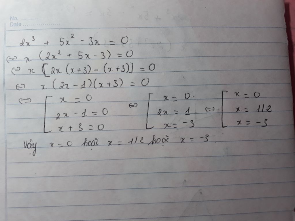`=>` \(\left[ \begin{array}{l}x=0\\2x-1=0\\x+3=0\end{array} \right.\) `=>` \(\left[ \begin{array}{l}x=0\\x=\dfrac{1}{2}\\x=-3\end{array} \right.\)