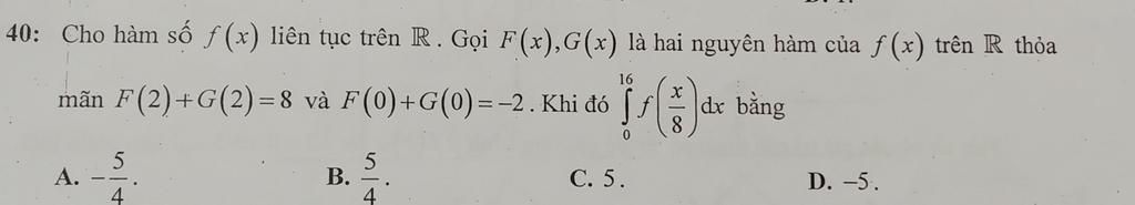 Vậy$\int\limits^{16}_0f {(\frac{x}{8}})dx\,$ `=8.`$\int\limits^2_0 {f(t)} \, dt$ `=8(F(2)-F(0))=40`