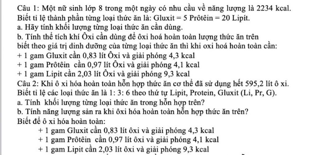 Câu 1: Một nữ sinh lớp 8 trong một ngày có nhu cầu về năng lượng là 2234 kcal.