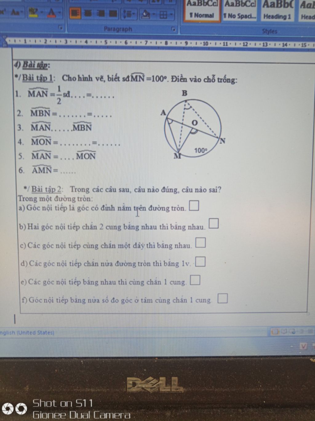 a. Góc nội tiếp là góc có đỉnh nằm trên đường tròn: Đúng