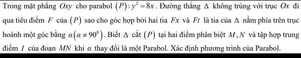 $\to $Phương trình của Parabol tập hợp trung điểm $I$ của đoạn $MN$ khi $\alpha$ thay đổi là: