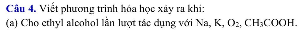 $\rm 2C_2H_5OH +2Na\to 2C_2H_5ONa+H_2\\ 2C_2H_5OH+2K \to 2C_2H_5OK+H_2\\ C_2H_5OH+O_2 \xrightarrow{\text{men giấm}} CH_3COOH+H_2O\\C_2H_5OH+3O_2\xrightarrow{t^o} 2CO_2+3H_2O\\CH_3COOH+C_2H_5OH \xrightarrow{t^o,H_2SO_4(đ)} CH_3COOC_2H_5+H_2O$