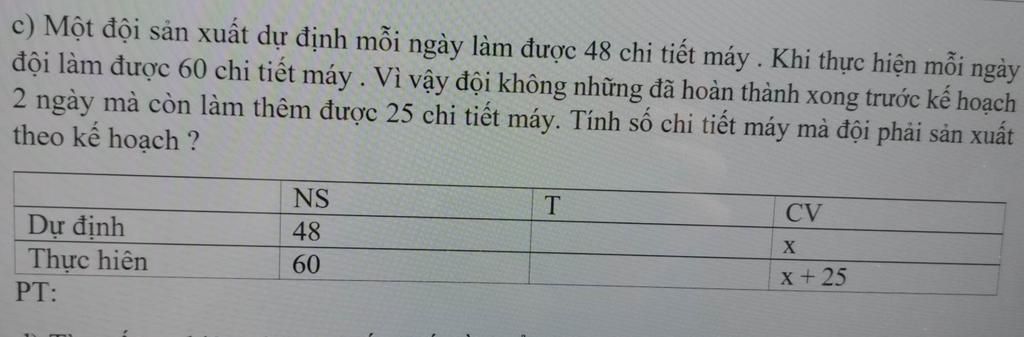 \begin{array}{|c|c|c|}\hline\text{}&\text{Năng suất}&\text{thời gian}&\text{công việc}\\\hline\text{Kế hoạch}&\text{48}&\text{x/48}&\text{x}\\\hline\text{Thực tế}&\text{60}&\text{(x+25)/60}&\text{x+25}\\\hline\end{array}
