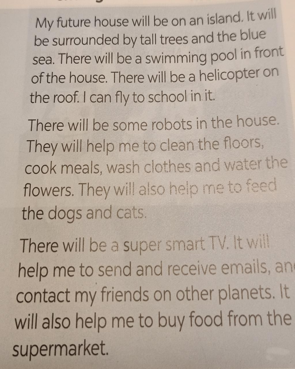 Ngôi nhà tương lai của tôi sẽ ở trên một hòn đảo. Nó sẽ được bao quanh bởi những cây cao và biển xanh. Sẽ có một hồ bơi ở phía trước của ngôi nhà. Sẽ có một chiếc trực thăng trên mái nhà. Tôi có thể bay đến trường trong đó. Sẽ có một số robot trong nhà. Họ sẽ giúp tôi lau sàn nhà, nấu ăn, giặt quần áo và tưới hoa. Họ cũng sẽ giúp tôi cho chó và mèo ăn. Sẽ có một TV siêu thông minh. Nó sẽ giúp tôi gửi và nhận email, liên lạc với bạn bè của tôi ở các hành tinh khác. Nó cũng sẽ giúp tôi mua thực phẩm từ siêu thị.