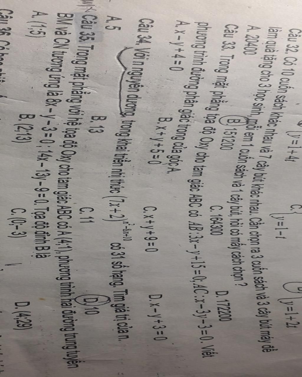 Câu 32. Có 10 cuốn sách khác nhau và 7 cây bút khác nhau. Cần chọn ra 3 cuốn sách và 3 cây bút máy để