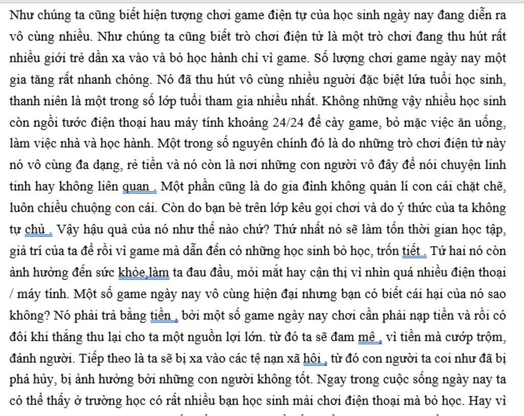Trong kỉ nguyên công nghệ như hiện nay, khi công nghệ và các trò chơi điện tử phát triển thịnh vượng như vũ bão thì cũng là lúc kéo theo nhiều vấn đề nổi cộm được dư luận quan tâm. Một trong số đó chúng ta phải kể đến chính là tình trạng nghiện game online. Game online được hiểu là các trò chơi điện tử trên điện thoại di động hoặc máy tính được sinh ra với vai trò, nhiệm vụ là giúp con người thư giãn, giải trí sau thời gian làm việc căng thẳng, mệt mỏi. Tuy nhiên hiện nay con người đang lạm dụng những trò chơi này quá mức hoặc có nhiều người đã “nghiện” trò chơi điện tử gây ra những hậu quả khó lường. Khi chúng ta nghiện game online, ta sẽ dành nhiều thời gian cho nó, đồng thời sẽ không có thời gian cho những việc khác dẫn đến mọi thứ trì trệ. Bên cạnh đó, việc chúng ta tiếp xúc với thiết bị điện tử quá nhiều sẽ gây hại cho đôi mắt, suy giảm thị lực thậm chí là suy giảm hệ thần kinh. Để tránh xảy ra hiện trạng này trước hết mỗi người cần biết cân đối thời gian của bản thân mình, sử dụng thời gian thật hợp lí cũng như tích cực tham gia hoạt động bên ngoài. Ngoài ra, chúng ta cần ưu tiên thời gian cho việc học tập, tu bổ đạo đức cũng như những sở thích, đam mê của bản thân để phát triển mình toàn diện nhất có thể. Tuy nhiên, vẫn còn có nhiều người chưa nhận thức được những mối nguy hại mà game online mang lại cũng như buông thả bản thân trôi theo những cám dỗ của trò chơi điện tử. Mỗi người biết vượt qua chính mình, hướng đến những điều tốt đẹp sẽ trở thành người có ích hơn, tận hưởng được trọn vẹn vẻ đẹp, khoảnh khắc của cuộc sống hơn. Mỗi chúng ta chỉ được sống một lần duy nhất, hãy sống và trải nghiệm thay vì ngồi đó với những trò chơi online.