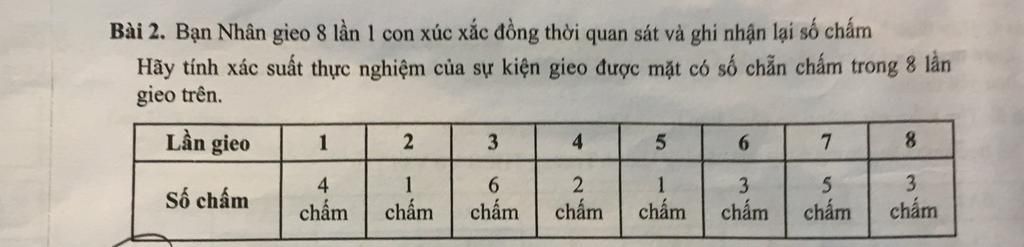 Xác xuất thực nghiệm của sự kiện gieo được mặt `2` chấm là `: 4/8 = 1/2`