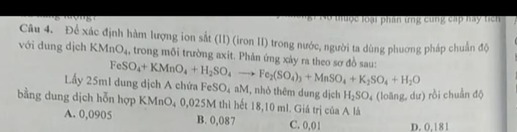 \(n_{KMnO_4^{}}^{} = 0,025.0,0181 = 4,{525.10^{ - 4}}\,mol\)