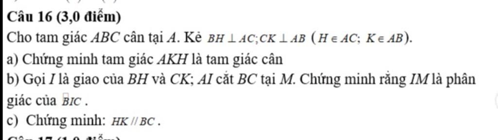 b.Từ câu a $\to \widehat{ABH}=\widehat{ACK}\to \widehat{IBK}=\widehat{ICH}$