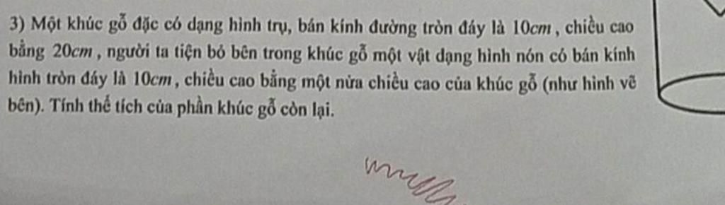 3) Một khúc gỗ đặc có dạng hình trụ, bán kính đường tròn đáy là 10cm, chiều cao