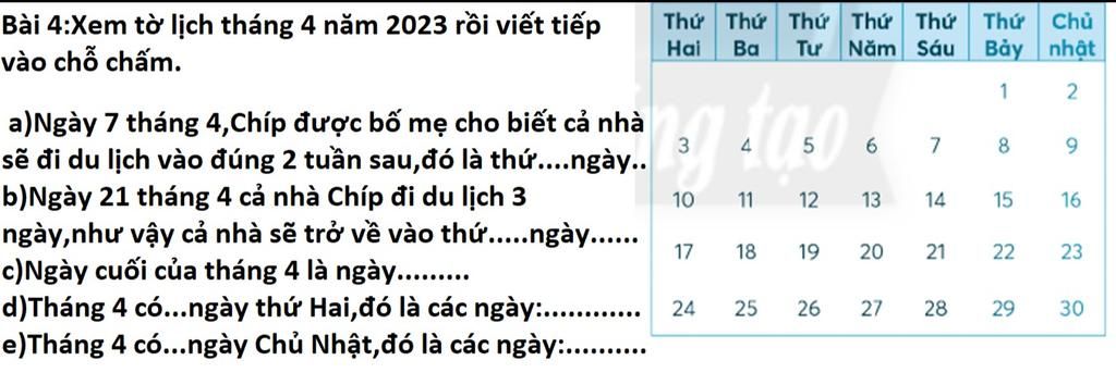 c) Nhìn vào lịch => tháng 4 có 30 ngày