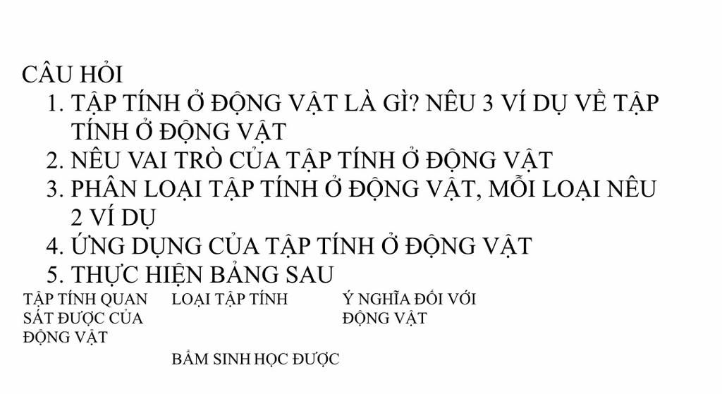 +Tập tính bẩm sinh: có sẵn từ khi sinh ra. VD: tập tính bú mẹ của chó con; tập tính ngủ một bên của cá heo.
