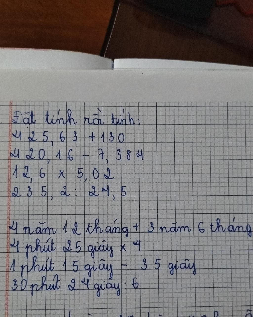 `+)` `30` phút `24` giây `:` `6` `=` `304` giây hay `5` phút `4` giây