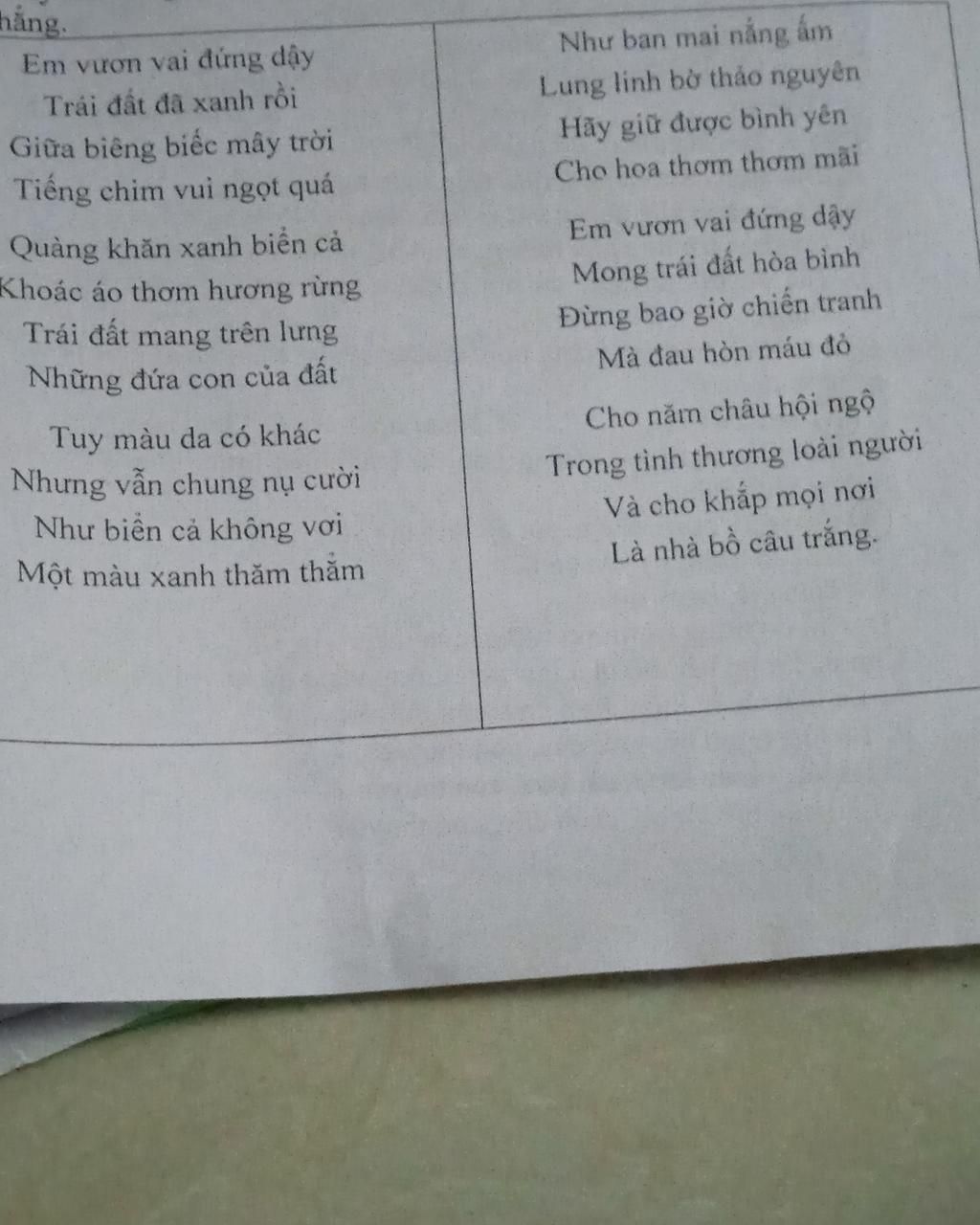 “Những đứa con của đất” có điểm gì riêng và điểm gì chung. Những câu thơ nào thể hiện mong muốn chung của mọi người trên Trái Đất. Em hiểu 2 dòng thơ cuối như thế nào. Các từ hãy, mong, đừng thể hiện điều gì. Hãy đặt câu với mỗi từ trên để thể hiện mong muốn của em về những điều cần làm cho cuộc sống trên Trái Đất tốt đẹp hơn.