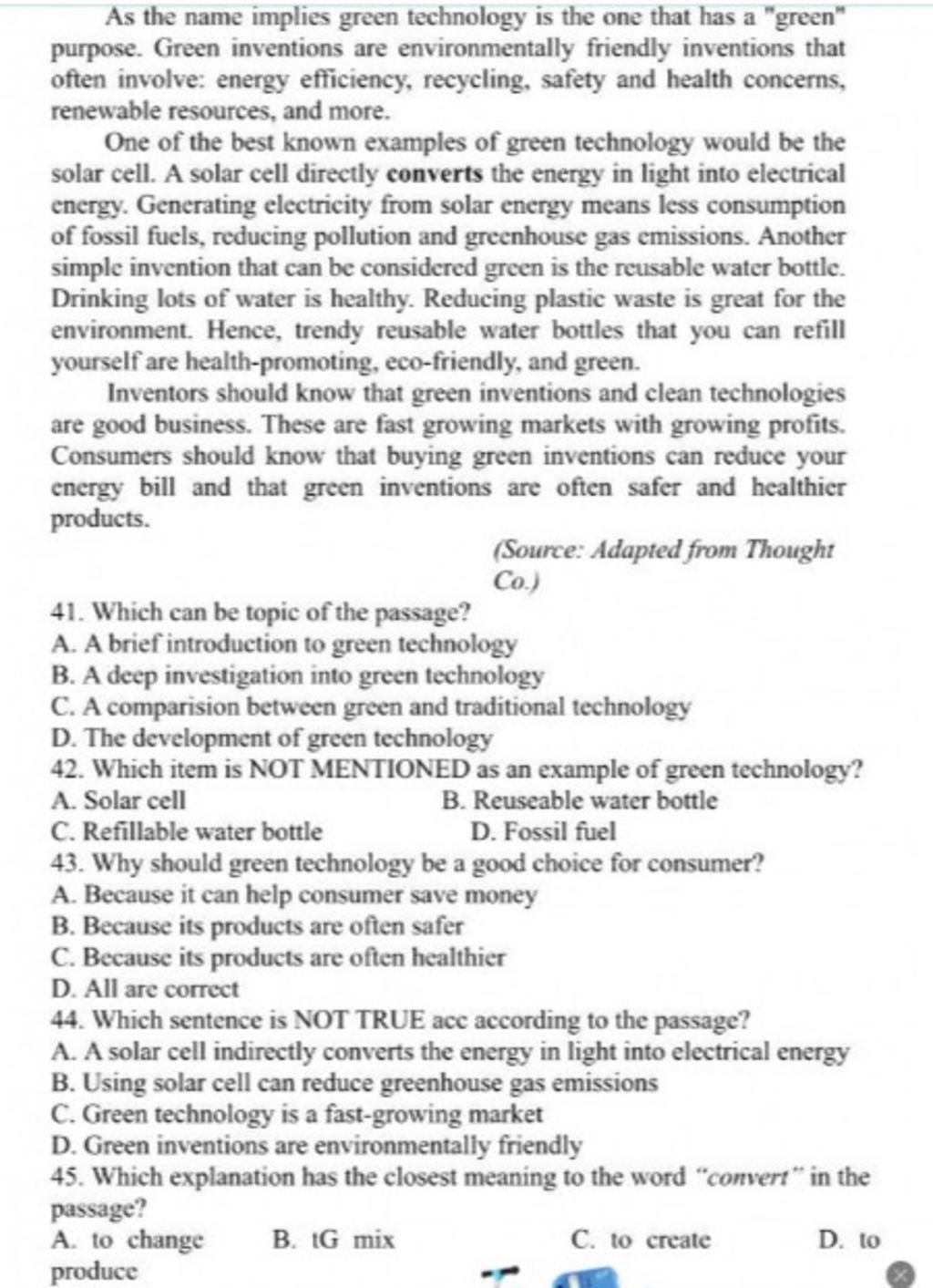 `-` D/C: A solar cell directly converts the energy in light into electrical energy. Another simple invention that can be considered green is the reusable water bottle.Reducing plastic waste is great for the environment.