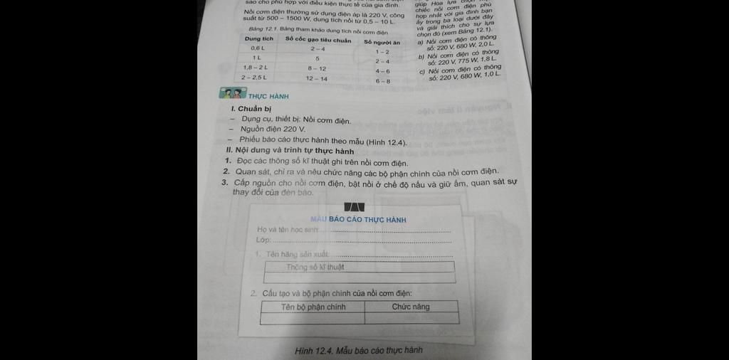 Bảng 12.1, Bằng tham khảo tung tích nồi cơm điện.