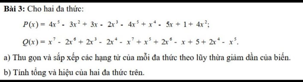 Tổng P(x) + Q(x)= (x4 - 2x3 + 7x4 + x + 1) + ( x5 - 2x4 + 2x3 - x + 5)