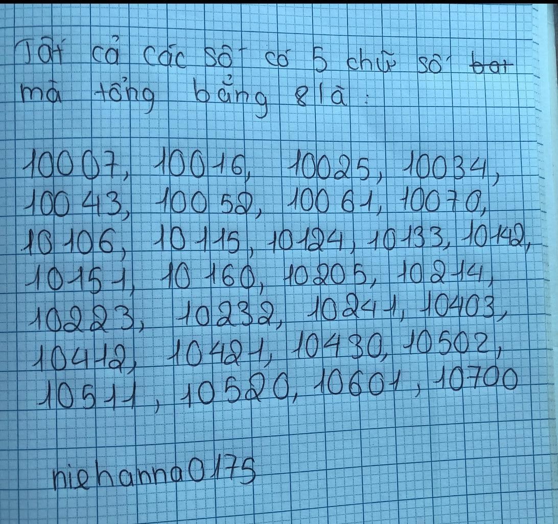 Viết tất cả các số có năm chữ số mà tổng năm chữ số của mỗi số đó bằng 8