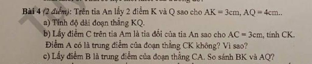 $a) K$ và $Q$ cùng thuộc tia $An$ và $AK<AQ(3<4)$