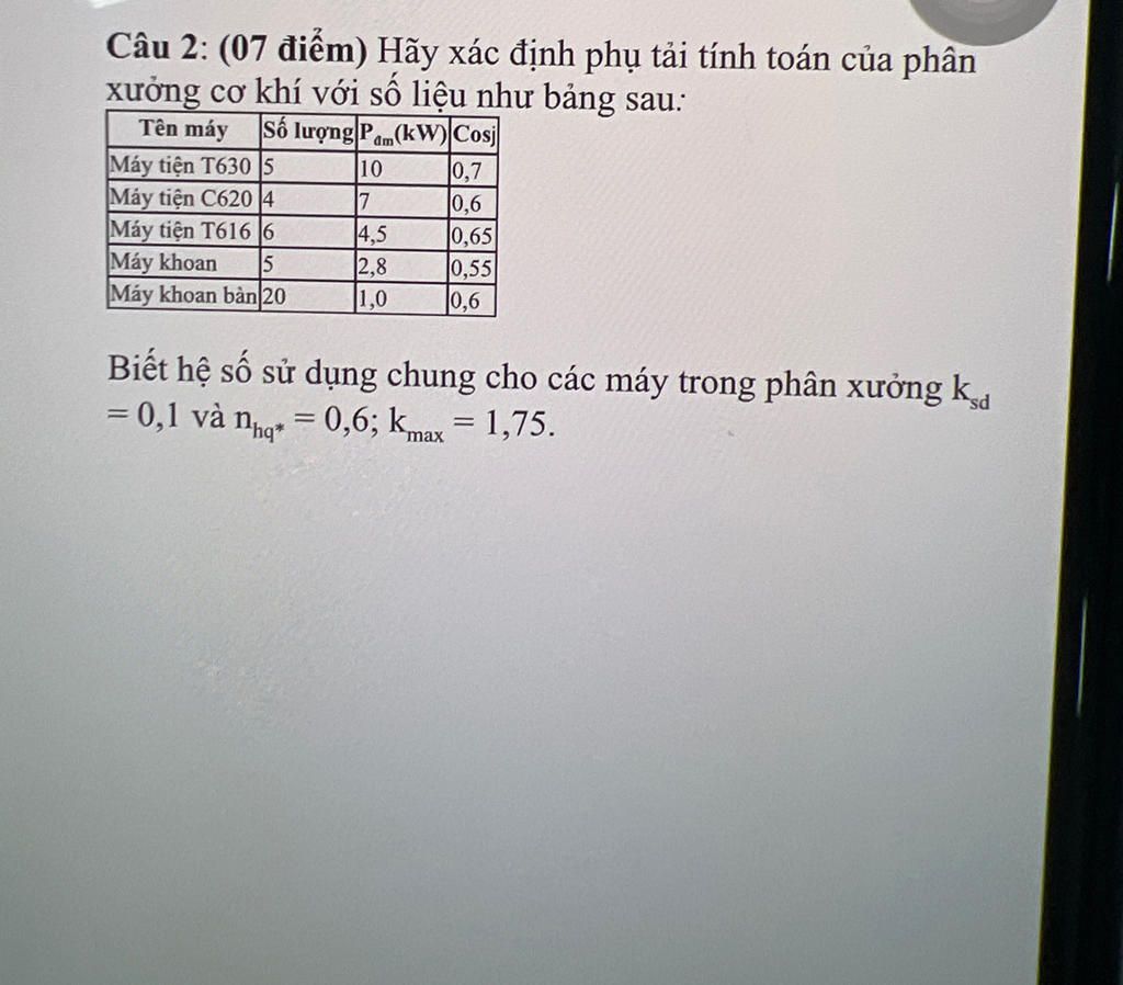 Hay xác dinh phu tai tinh toán cua phan xuöng co khi vói so liêu nhur bäng