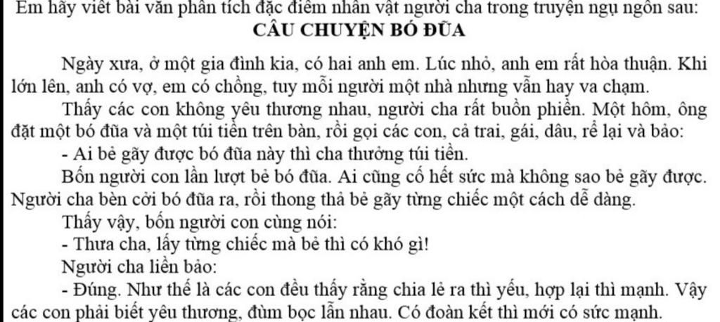 Người cha trong câu chuyện bó đũa là một nhân vật vô cùng quan trọng, ông đã dạy cho các anh em trong nhà một bài học về tính hòa thuận. Giữa tình thế các con chia rẽ, không yêu thương lẫn nhau, người cha đã thấu hiểu và suy nghĩ ra một bài học để các con hòa thuận nhau hơn để có một cuộc sống tốt đẹp với tình anh em. Ông không chọn cách giáo dục "đao to búa lớn" mà nhẹ nhàng khuyên răn từ câu chuyện bó đũa. Các con đều bẻ cả bó một cách mạnh mẽ mà không suy nghĩ thấu đáo nhưng rất khó khăn. Ngược lại, người cha lại bẻ từng cái một rất dễ dàng. Từ đó Người cha đã dạy cho các anh em biết hòa thuận. Chỉ có như vậy mới đoàn kết chống lại khó khăn trong cuộc sống có thể làm chia rẽ tình cảm gia đình. Người cha còn cho con mình những bài học quý giá về sự đoàn kết trong cuộc sống và bài học về sự chia sẻ và yêu thương lẫn nhau. Nhân vật người cha đóng vai trò quan trọng trong cả câu chuyện, một người đi trước thấu hiểu, uyên bác dẫn lại đường lối hòa thuận cho các anh em chung một nhà.