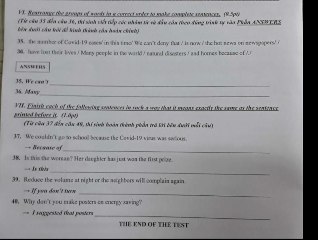 (Từ cầu 35 đến câu 36, thí sinh viết tiếp các nhóm tử và dấu câu theo đúng trình tự vào Phần ANSWERS