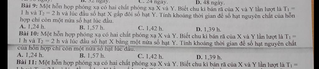 9. Lúc đầu số hạt `X` gấp đôi số hạt `Y ⇒ N_{01}=2N_{02}`