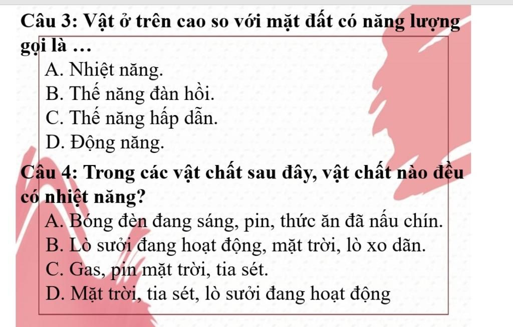 Câu `3 :` Vật ở trên cao so với mặt đát có năng lượng gọi là thế năng hấp dẫn