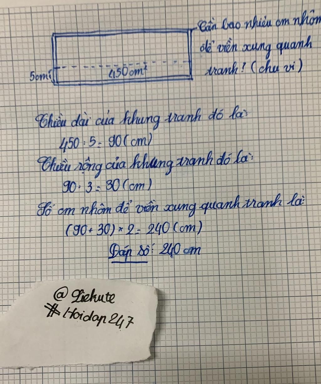 Câu 3. Bác An có một khung tranh hình chữ nhật có chiều dài gấp 3 lần chiều rộng. Nếu bác An định giảm chiều rộng đi 5 cm, thì diện tích khung tranh giảm đi 450 cm2. Vậy bác An cần bao nhiêu xăng ti mét nhôm để viền xung quanh khung ảnh đó?
