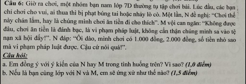 a. Em đồng ý với ý kiến của M trong tình huống trên. Vì đánh bạc là hành vi của tệ nạn xã hội, pháp luật nước ta quy định trẻ em không được đánh bạc và nghiêm cấm hành vi dụ dỗ, lôi kéo, dẫn dắt hay cho trẻ em đánh bạc. Việc chơi ăn tiền sẽ hình thành cho các bạn thói xấu là mỗi lần chơi trò chơi đều phải phạt bằng tiền, lâu dần tăng mức tiền lên cao chứ không chỉ dừng ở 1000 đồng, 2000 đồng khiến các bạn không có tiền trả. Nếu việc này diễn ra thường xuyên thì nguy cơ sa vào tệ nạn xã hội ở mức nặng hơn có thể xảy ra.