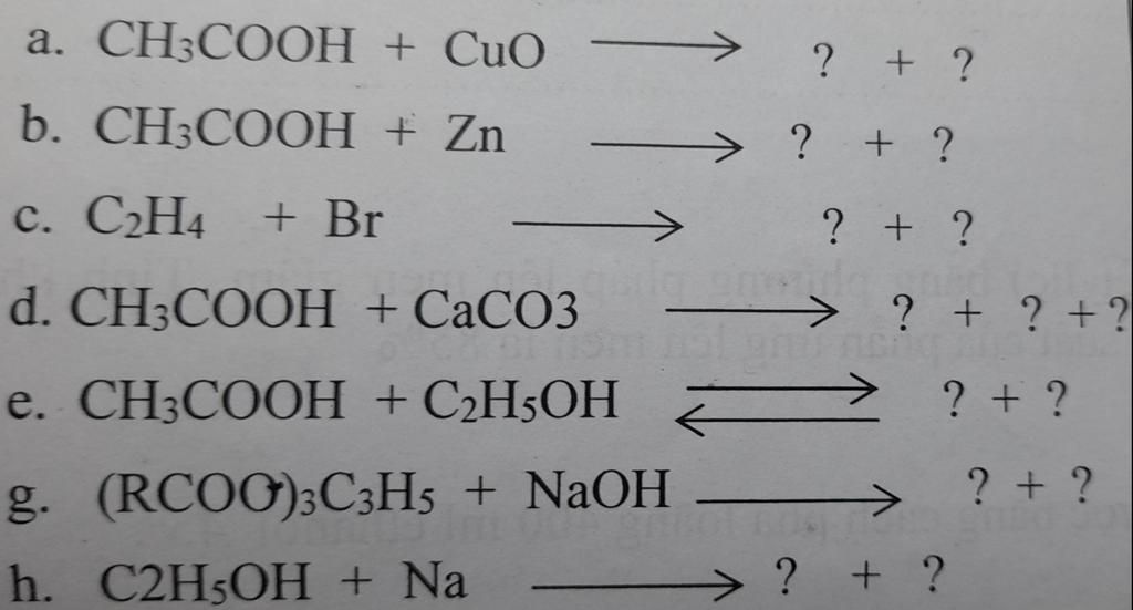 $\text{e) CH$_{3}$COOH + C$_{2}$H$_{5}$OH$\xrightarrow{t^o , H_2SO_4 đặc}$ CH$_{3}$COOC$_{2}$H$_{5}$ + H$_{2}$O }$