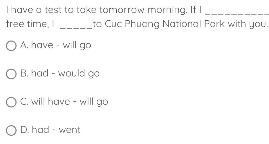 "I have a test to take tomorrow morning" (tôi có một bài kiểm tra phải làm vào sáng mai) `->` Người nói không có thời gian rảnh `=>` Câu điều kiện kể về sự việc không có thật ở hiện tại hoặc tương lai