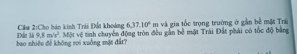 Câu 2. Cho bán kính Trái Đất khoảng 6,37.10^6 m và gia tốc trọng trường ở gần bề mặt Trái Đất là 9,8m/s^2. Một vệ tinh chuyển động tròn đều gần bề mặt Trái Đất phải có tốc độ bằng bao nhiêu () để không rơi xuống mặt đất?