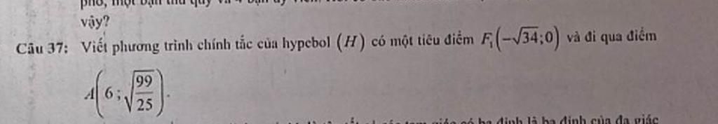 Tiêu điểm $\rm F_1(-\sqrt{34};0)$`to c=\sqrt{34}`
