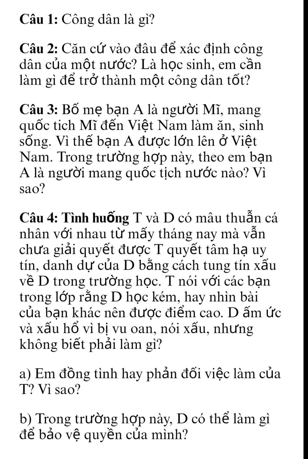 Câu 3 : $\text{Bạn A là người mang quốc tịch Việt Nam, bố mẹ của A là người Mỹ, đến Việt Nam}$