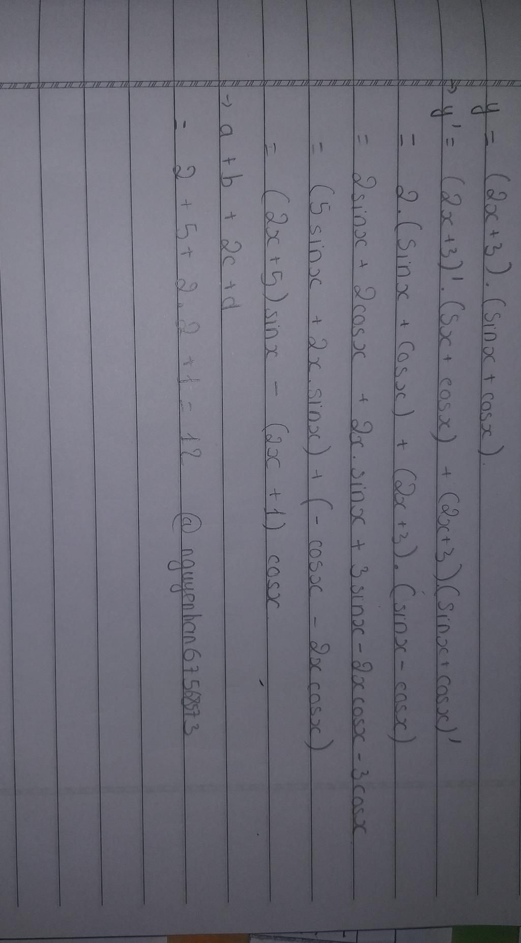 đạo hàm của hàm số y = (2x+3)(sinx+cosx) có dạng ý =(ax+b)sinx+(cx+d)cosx tính a+b+2c+đ