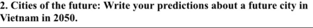 Your last email asked me about my city Ha Noi in 2050. Well, but I'm busy and have no time to reply you soon. Today I am writing to you about that question. There are different ideas about this question. I thought about it in a few days, and now I can give you some predictions.