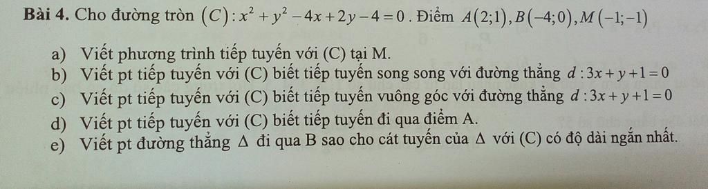 Bài 4. Cho đường tròn (C):x + y −4x+2y−4=0 . Điểm A(2;1),B(-4;0),M(-1;-1)