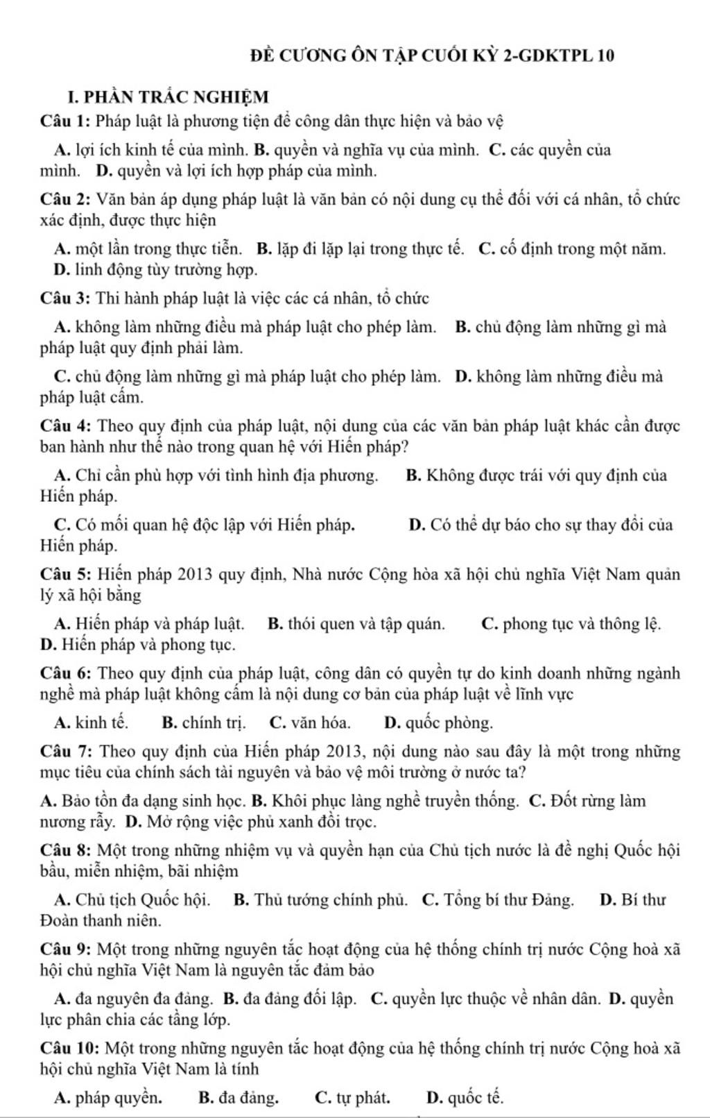 ĐỀ CƯƠNG ÔN TẬP CUỐI KỲ 2-GDKTPL 10