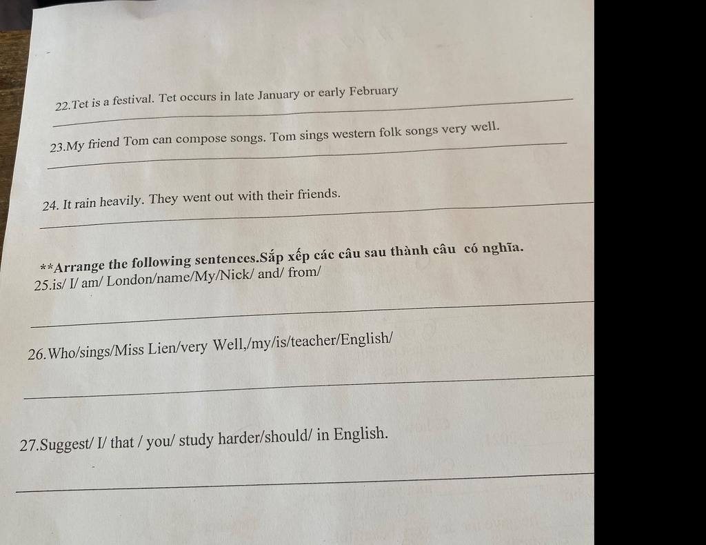 **Arrange the following sentences.Sắp xếp các câu sau thành câu có nghĩa.