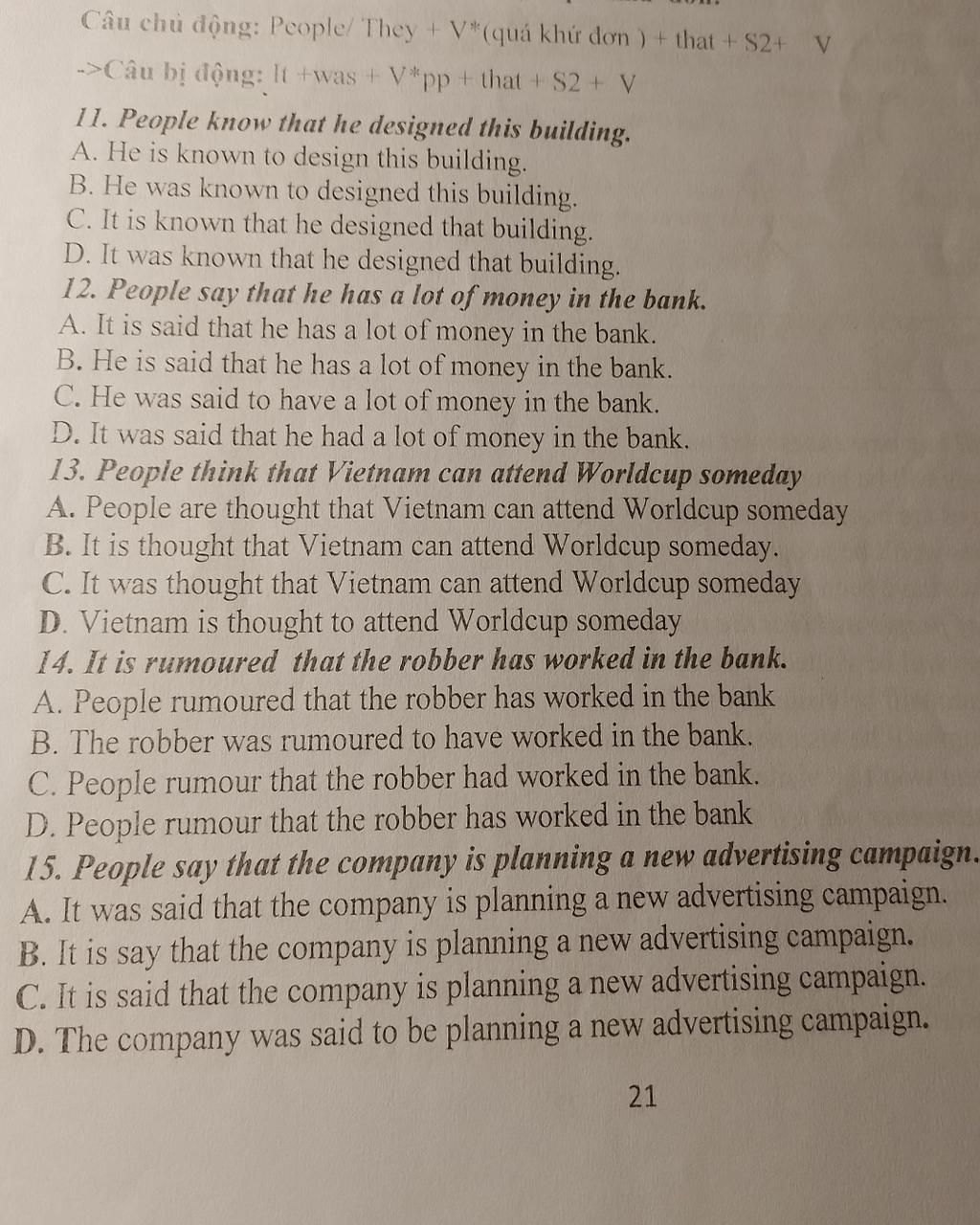 `-` Cả vế trước và vế sau đều chia ở HTĐ `=>` cùng thì `=>` bị động: It is said that + clause