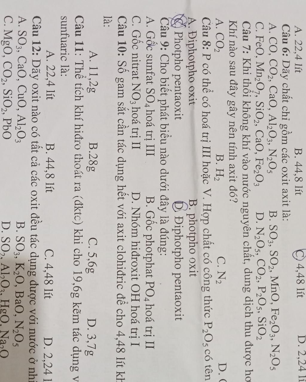 Câu 6: Dãy chất chỉ gồm các oxit axit là: