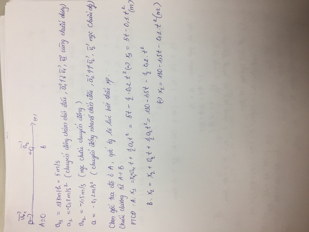 \({x_{02}} = 130;\,\,{v_{02}} = - 18km/h = - 1,5m/s;\,\,{a_{02}} = - 0,2m/{s^2}\)
