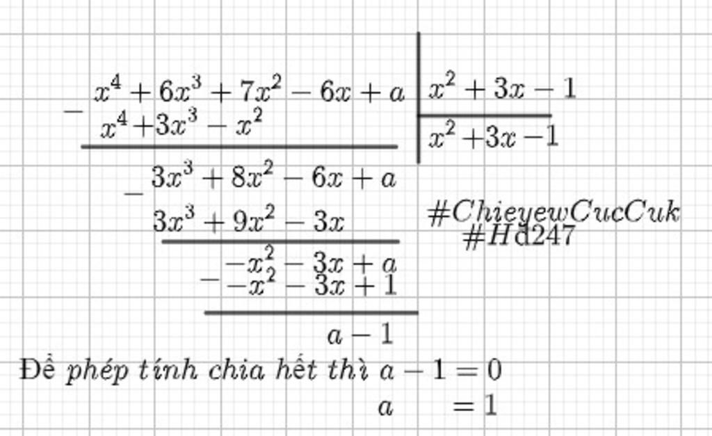 Để đa thức x^4+6x^3+7x^2-6x+a chia hết cho x^2+3x-1 thì a-1=0