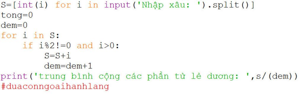 n = int(input("Nhập số phần tử mảng: "))a = [int(x) for x in input("Nhập dãy: ").split() if int(x) % 2]print("Trung bình cộng:", sum(a)/len(a))