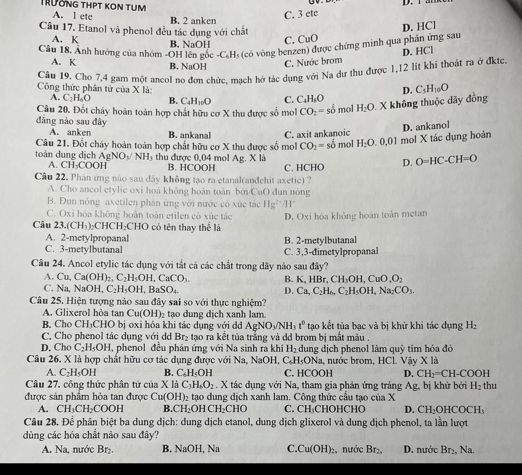 Etanol không tác dụng với $Cu, Ca(OH)_2, CaCO_3, BaSO_4, NaOH, C_2H_6, Na_2CO_3$