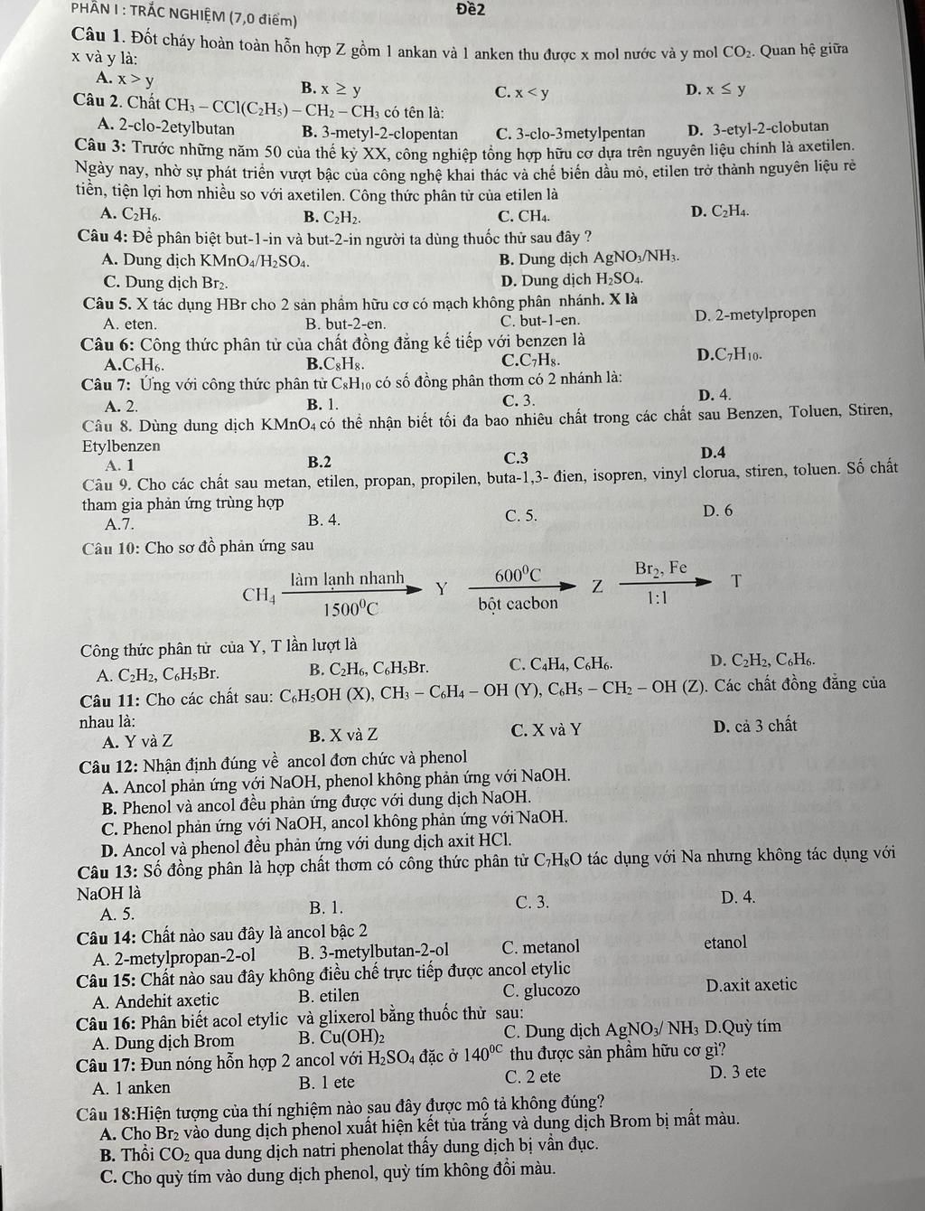 Câu 1. Đốt cháy hoàn toàn hỗn hợp Z gồm 1 ankan và 1 anken thu được x mol nước và y mol COz. Quan hệ giữa