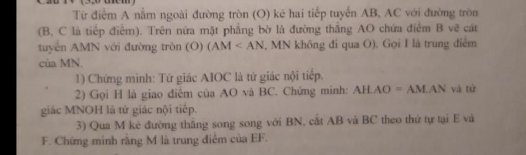tuyến AMN với đường tròn (O) (AM < AN, MN không đi qua Ở). Gọi I là trung điểm
