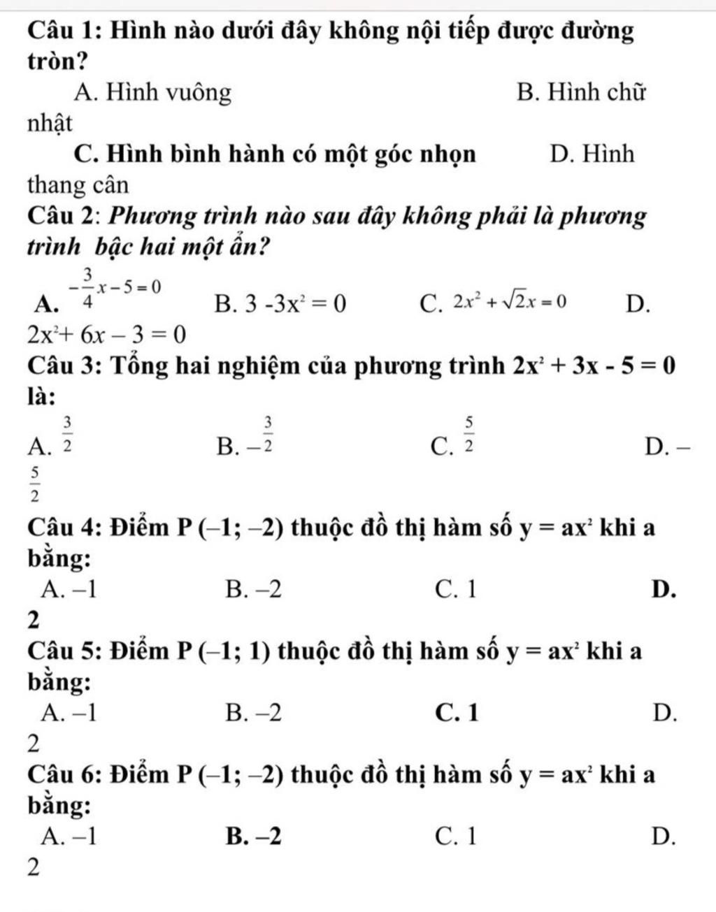 Câu `5:` Thay `x=-1` và `y=1` vào `y=ax^2`