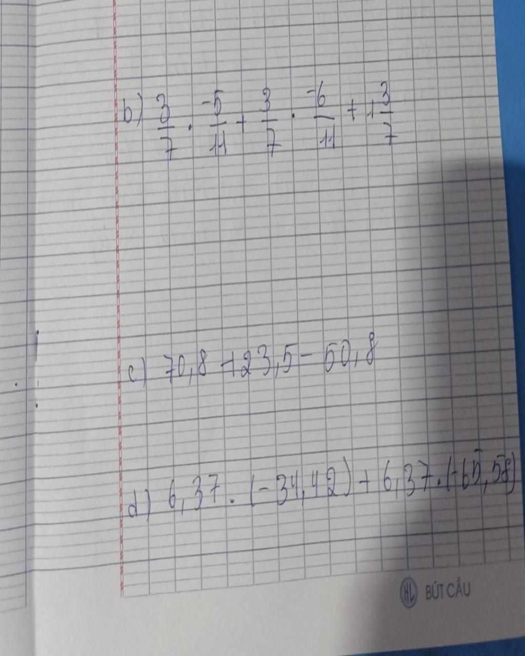 `b)` `3/7.(-5)/11+3/7.(-6)/11+1(3)/7`